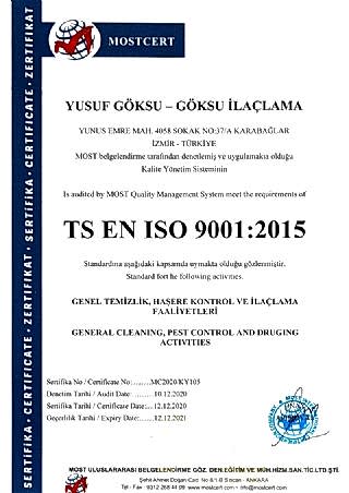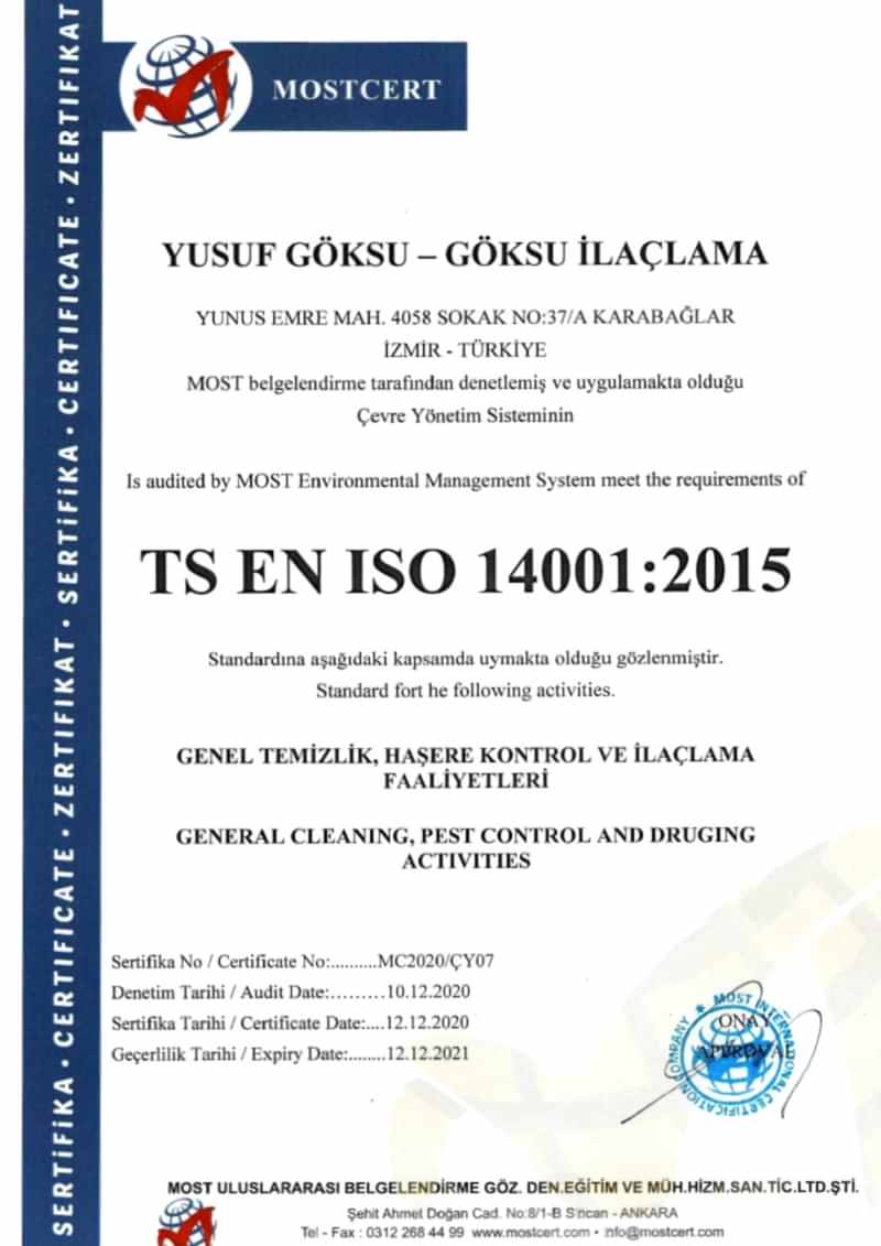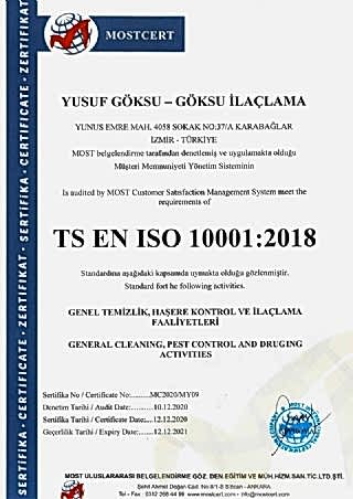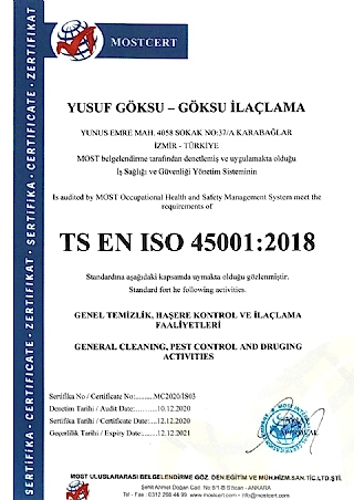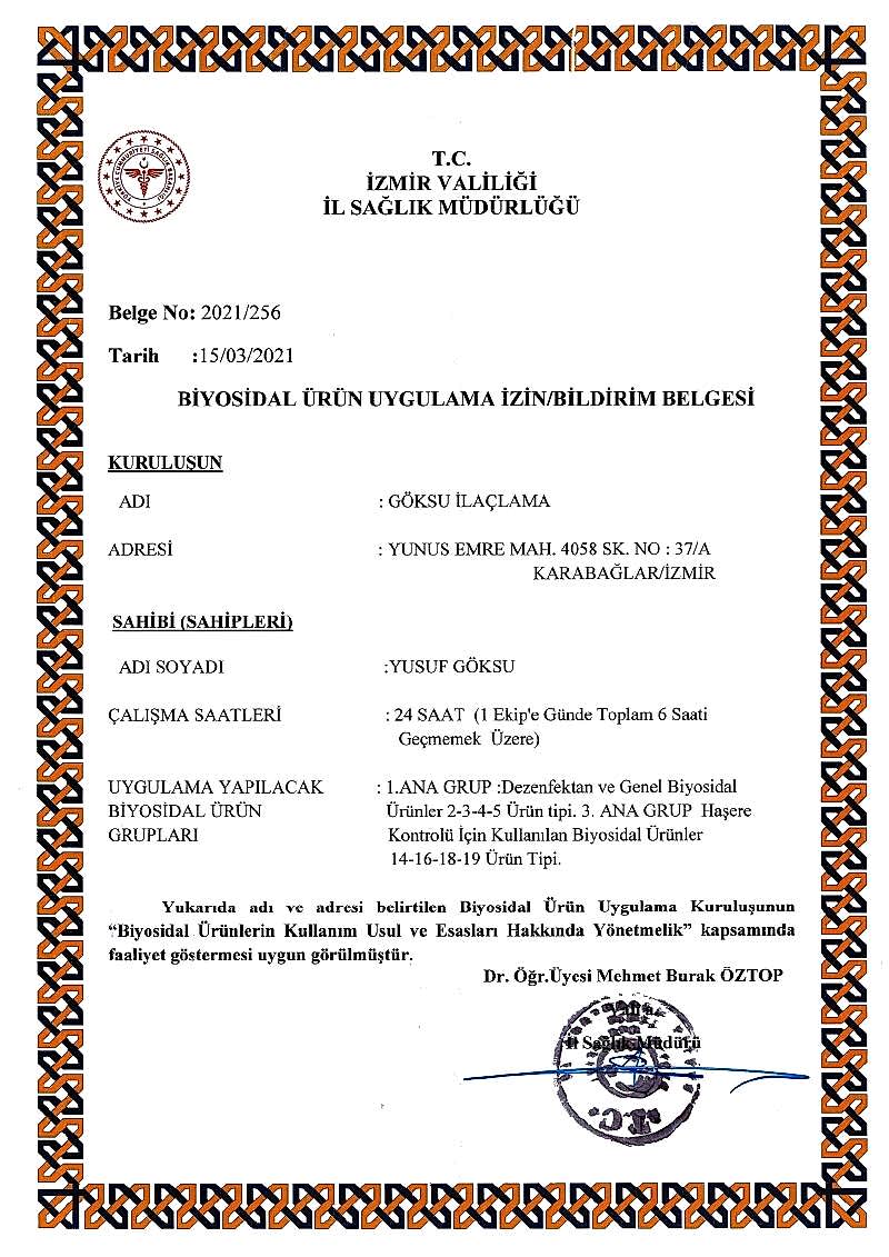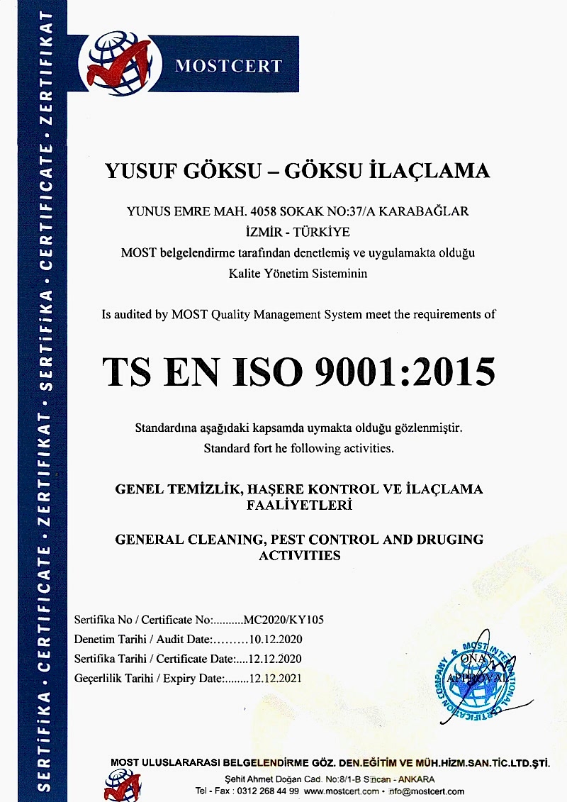 Göksu İlaçlama , insan ve çevre sağlığına zararı olmayan Dünya Sağlık Örgütü tarafından onaylanıp (WHO), Sağlık Bakanlığınca ruhsatlandırılmış, TSE Belgeli, ithal, kokusuz, uzun süre etkili, ilaçlarla haşerelerden kesin olarak kurtulmanın garanti ve güvencesini vermektedir.